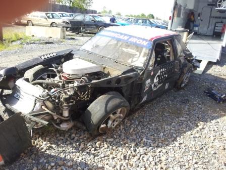 Short version: was into the turn hot, turn was very slick the entire event, tracked out a bit far ( had been out ther before w/o incident ), believe's he must have caught a rut or other it snapped & tossed it cross track into the wall ....